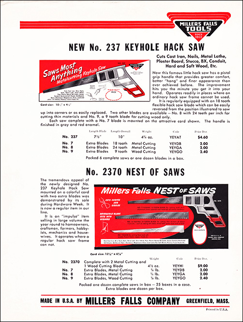 An update to the company's Hand Tools, Portable Electric Tools, Hacksaws: Catalog No. 49, it features the No. 237 keyhole saw. Originally a Goodell-Pratt tool, the Millers Falls Company redesigned the handle of the No. 237 in 1949—a change that resulted in a more streamlined appearance. The circular also promotes the No 2370 nest of saws, a carded set consisting of the No. 237 keyhole saw with two extra blades mounted on a two-color card. Single-sided.