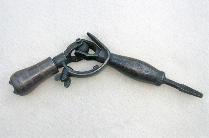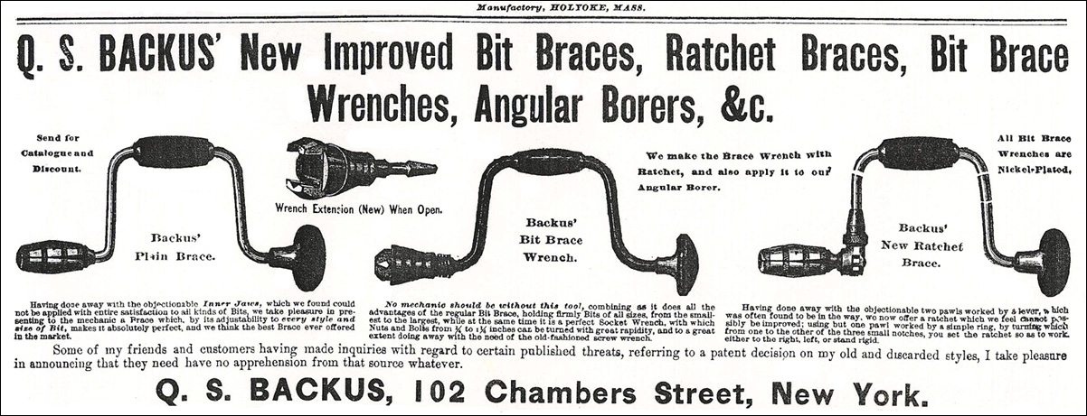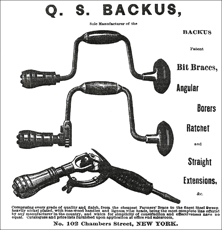 On November 5, 1872 Quimby S. Backus was issued United States Letters Patent No. 132,791 for a bit brace. The patent covered both the brace's sweep handle and its chuck. Backus manufactured a variety of braces and attachments that featured his chuck design; the handle design was used only on his firm's premium braces.