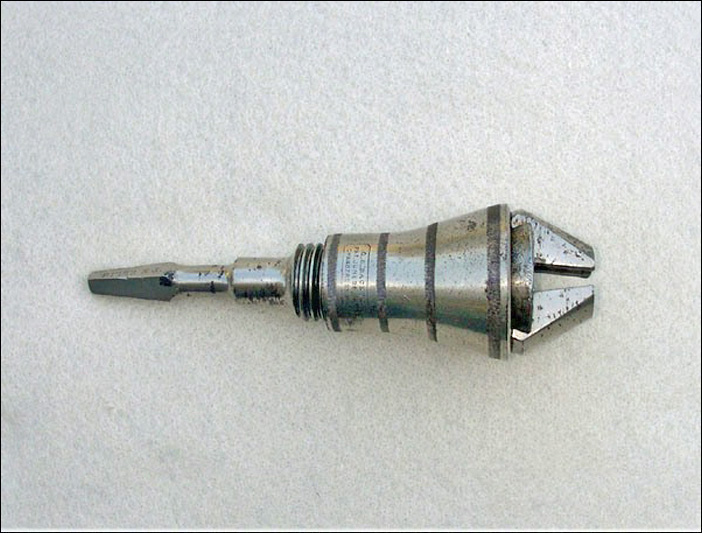 Sometime prior to 1880, Quimby Backus acquired the rights to a chuck that had been patented by William W. Draper on July 11, 1865 (Patent No. 48,763). Backus reworked the design and came up with a brace that bore little resemblance to that depicted in Draper's original patent drawings. The Backus redesign features a bizarre-looking chuck that consists of two massively oversized jaws pinned to a nut that travels up and down the threads of its socket. As the nut travels up the socket, the rear edges of the jaws encounter a cone that spread them apart. Since the jaws pivot at mid-point, their front parts move inward, closing over the shoulders of a square-tang bit.