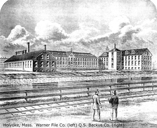 For reasons unknown, the Q. S. Backus operation relocated to Holyoke, Massachusetts. Although the timing of the move is uncertain, manufacturing was underway at the new site by 1876. Situated on the Connecticut River, Holyoke was a booming manufacturing center with a huge dam and an elaborate, three-level system of mill canals. The Q. S. Backus Company made its tools in a three-and-one-half-story building in Holyoke at the intersection of Appleton Street and the city’s Second Level Canal. Production moved back to Winchendon in the early 1880s; the New York sales office moved to 102 Chambers Street at about the same time.
