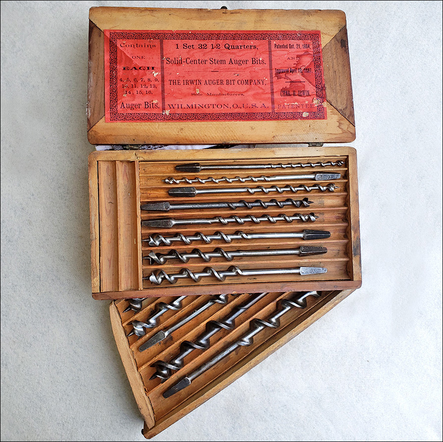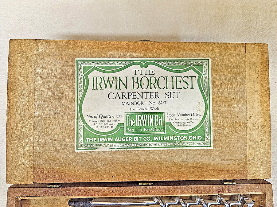 - small green lid-label attached to interior of box lists manufacturer as: The Irwin Auger Bit Company