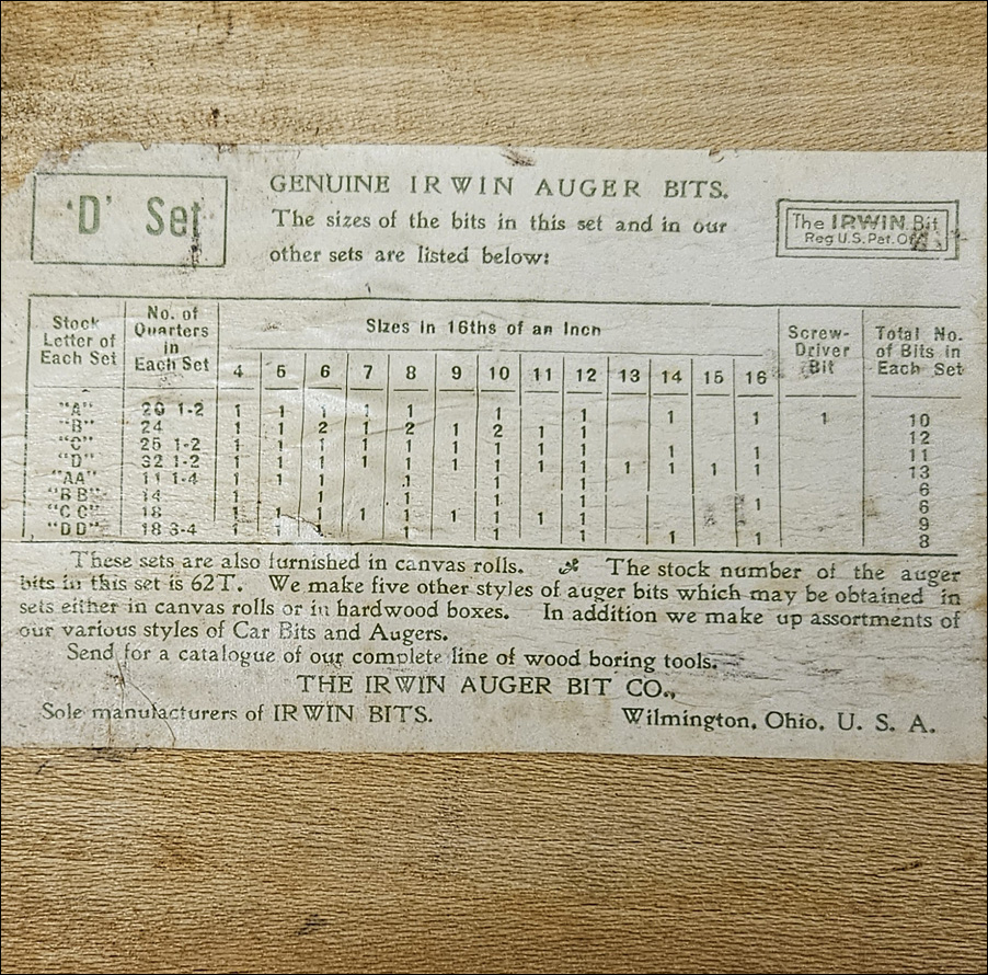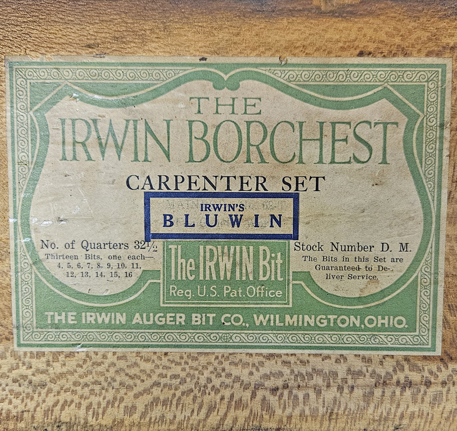 - “THE IRWIN BIT” stamped on lid in gold ca. 1936