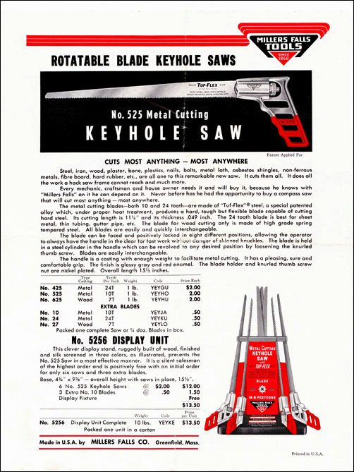 An update to the company's Hand Tools, Portable Electric Tools, Hacksaws: Catalog No. 49, it features the No. 237 keyhole saw. Originally a Goodell-Pratt tool, the Millers Falls Company redesigned the handle of the No. 237 in 1949—a change that resulted in a more streamlined appearance. The circular also promotes the No 2370 nest of saws, a carded set consisting of the No. 237 keyhole saw with two extra blades mounted on a two-color card. Single-sided.