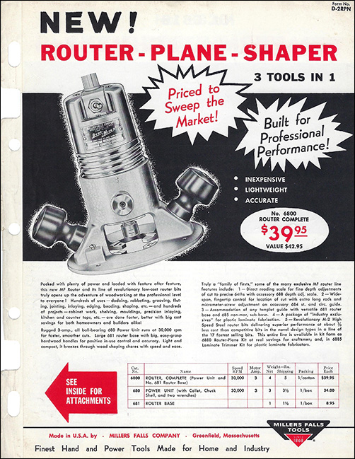 Title from cover. A counter-top promotion printed on both sides, folded three times to form a booklet. Introduces the No. 6800 router. An optional attachment allowed a user to use the power unit to power a hand-held 14-inch planer. A shaper attachment allowed a customer to use the power unit and a 1-inch piece of plywood (supplied) to create either a shaper or jointer table. Beneath the cover illustration is a red-colored blank space for a hardware dealer's stamp.