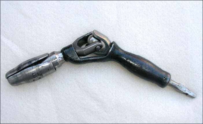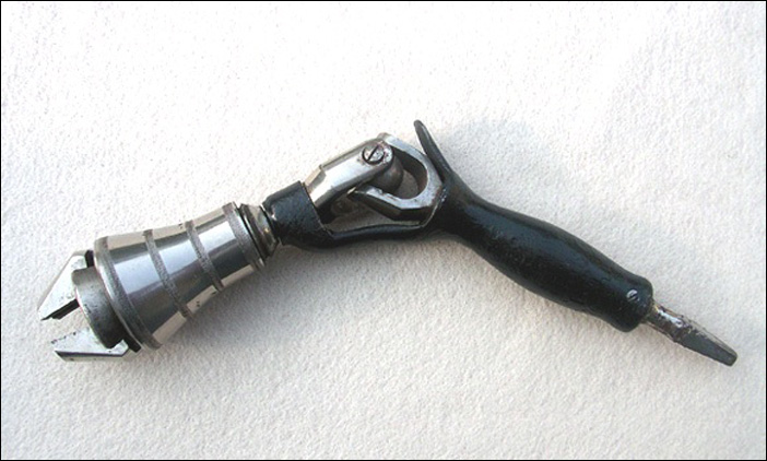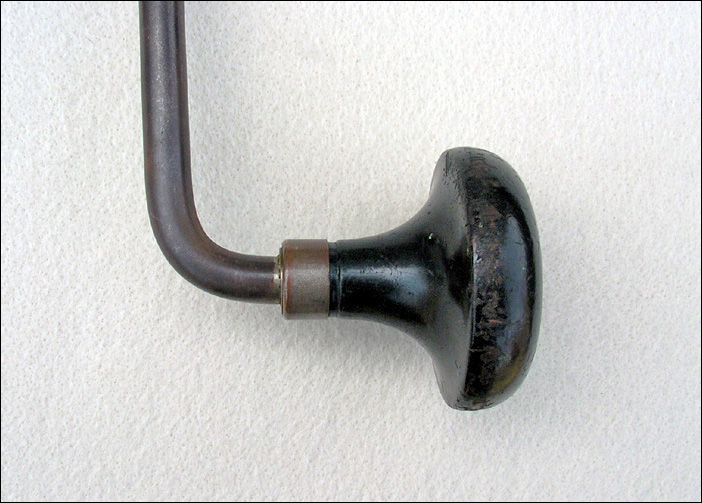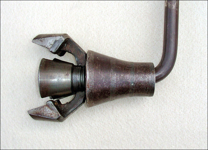 Sometime prior to 1880, Quimby Backus acquired the rights to a chuck that had been patented by William W. Draper on July 11, 1865 (Patent No. 48,763). Backus reworked the design and came up with a brace that bore little resemblance to that depicted in Draper's original patent drawings. The Backus redesign features a bizarre-looking chuck that consists of two massively oversized jaws pinned to a nut that travels up and down the threads of its socket. As the nut travels up the socket, the rear edges of the jaws encounter a cone that spread them apart. Since the jaws pivot at mid-point, their front parts move inward, closing over the shoulders of a square-tang bit.