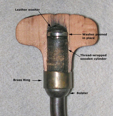 Backus & Company soon moved away from the use of metallic heads on its premium braces, replacing them with lignum vitae. A second category of economy-grade models with wooden parts of domestic hardwood was introduced as well. The lignum heads were simply threaded onto a brace’s quill; the economy-grade heads were held in place via a friction fit. Neither attachment mechanism was innovative. Domestic hardwood heads were forced down over a hollow wooden cylinder in the manner of a number of other vendors. The cylinder, sometimes wrapped with string, was held captive between a bolster and, at top, a washer peened into place. The company later added a bolster made of a brass washer to its lignum vitae models, a change that reduced drag on the rotation of the head.