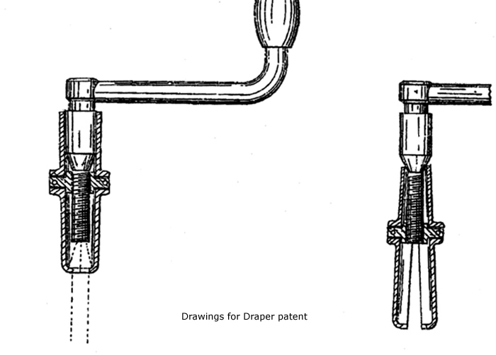 At some point prior to 1880, Quimby Backus acquired the rights to a brace patented by William W. Draper on July 11, 1865.(8) Draper, a resident of Greenfield, Massachusetts, had originally assigned one-half of the patent to himself and the other half to Alonzo Parker, one of the principals of the Greenfield Tool Company. Backus reworked the Draper design and came up with a brace that bore little resemblance to that depicted in the original patent drawings. The brace featured a bizarre-looking chuck that consisted of two massively oversized jaws pinned to a nut that traveled up and down the threads of its socket. As the nut traveled up the socket, the rear edges of the jaws encountered a cone that spread them apart. Since the jaws pivoted at mid-point, their front parts moved inward, closing over the shoulders of a square-tang bit. Backus Draper-type braces were offered with and without ratchets in both the economy and premium grades. The Backus bit brace gallery illustrates these and some of the other boring tools designed by Q. S. Backus.