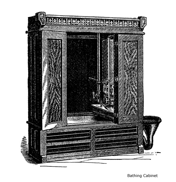 The first dozen pages of the catalog document the results of Backus's entry into the world of indoor plumbing. At the time, residents of the typical American home bathed in water heated on a kitchen stove and indoor toilet facilities were rare. Businessmen wanting to exploit the market for a convenient and comfortable bathing and toileting experience needed to be cognizant of the fact that most housing did not contain a separate room for these purposes. One solution to the problem was to develop wooden cabinets that