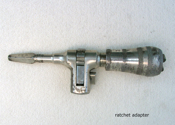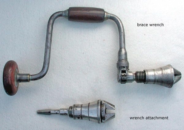In 1879, Quimby Backus patented an attachment for converting a bit brace to a socket wrench. The drawings accompanying the published document illustrate both non-ratcheting and ratcheting versions of the tool.(13) The ratchet depicted is the lever-adjustment design used