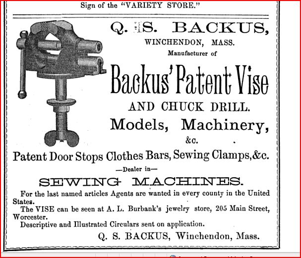 An advertisement on page 26 of the Worchester Directory for 1869 indicates that Q. S. Backus was manufacturing hardware and operating a sewing machine distributorship while working on his inventions in Winchendon. His three vise patents became the basis for a new enterprise, the Backus Vise Company. The most important, United States Letters Patent No. 78,565, was issued for a vise with its screw enclosed in a telescoping tube that protected it from dirt and shavings. Eager to secure as much protection for his idea as possible, Backus applied for and received United States Design Patent No. 3,130 which covered the vise as well. His third vise patent, No. 91,068, was issued for a telescoping tube vise equipped with a bench mount that allowed it to be rotated or repositioned by sliding it back and forth. The Backus Vise Company was organized on August 27, 1869. The operation was headquartered in Windsor, Vermont, where it leased shop space from the Windsor Manufacturing Company. By the following May, it was turning out 400 vises per month. Capitalized at $30,000, one-third of the shares were allotted to Quimby Backus as payment for his patents and the small business he had been operating. J. S. Farnsworth served as company president, R. H. Lamson as treasurer, and Quimby Backus as plant superintendent.(3)
