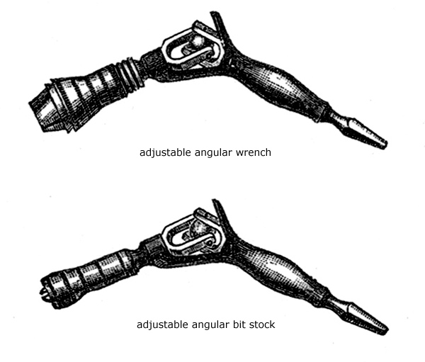 An interesting variant of the socket wrench chuck was an adapter described as an "adjustable socket angular wrench." Designed to allow a brace user to turn nuts and bolts in corners, the device differed from the Backus angular bit stock in that it was manufactured to operate at a fixed angle. The torque generated in tightening 1 1/4 inch nuts would have played havoc with the delicate angle adjustment mechanism used for the original Backus adjustable angular bit stock. By 1884, if not earlier, the casting for the angular socket wrench had become the norm for the angular bit stock as well, and the less-useful, fixed angle tool was referred to as an "improved" rather than "adjustable" angular borer.